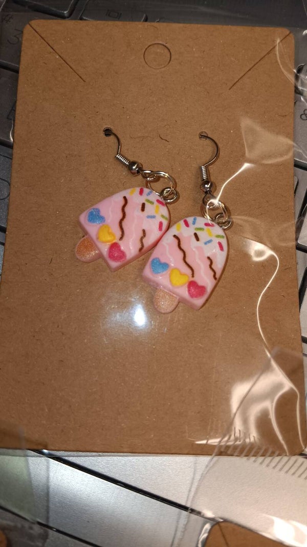 Add a splash of fun and color to your outfit with these delightful popsicle-shaped earrings. Each earring features a vibrant yellow popsicle adorned with colorful decorations, including a playful red heart, a charming blue heart, and a sprinkle of multicolored dots. The popsicles are drizzled with white icing and detailed with wavy brown lines, reminiscent of a sweet syrupy treat.