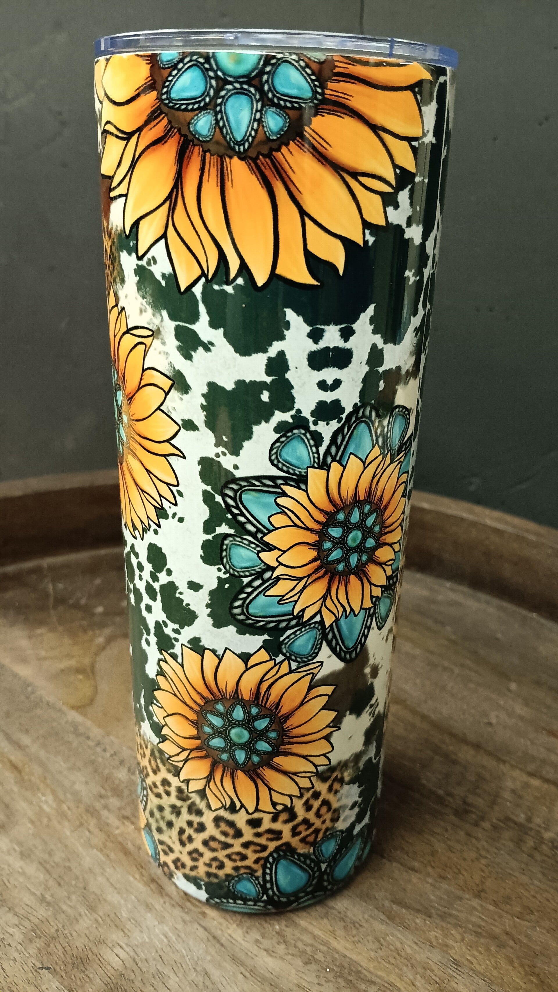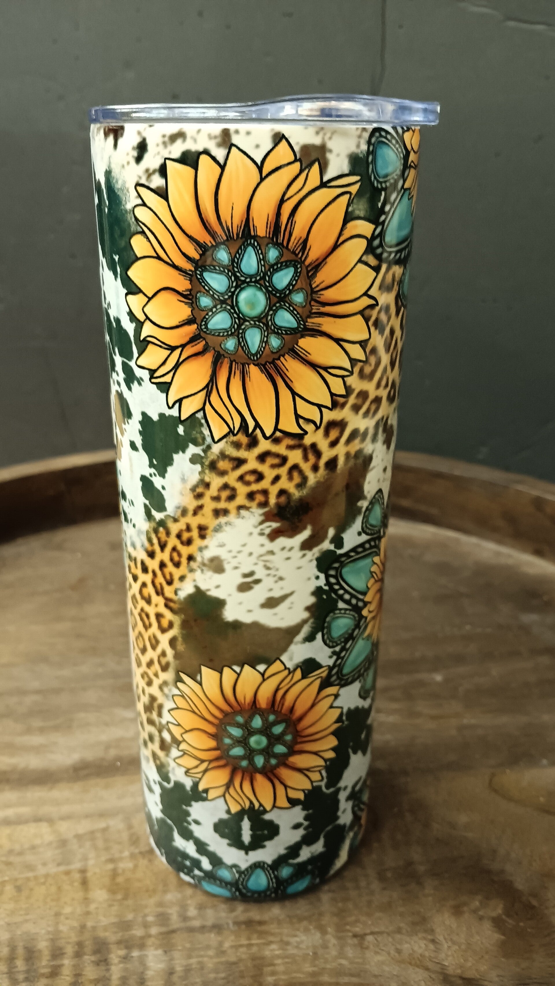 Turn heads with this bold and beautiful 20 oz tumbler that blends wild charm with floral elegance. Featuring radiant sunflowers with turquoise centers, edgy leopard print accents, and rustic cowhide-inspired splashes in earthy greens, browns, and whites, this design is a celebration of contrast and creativity.