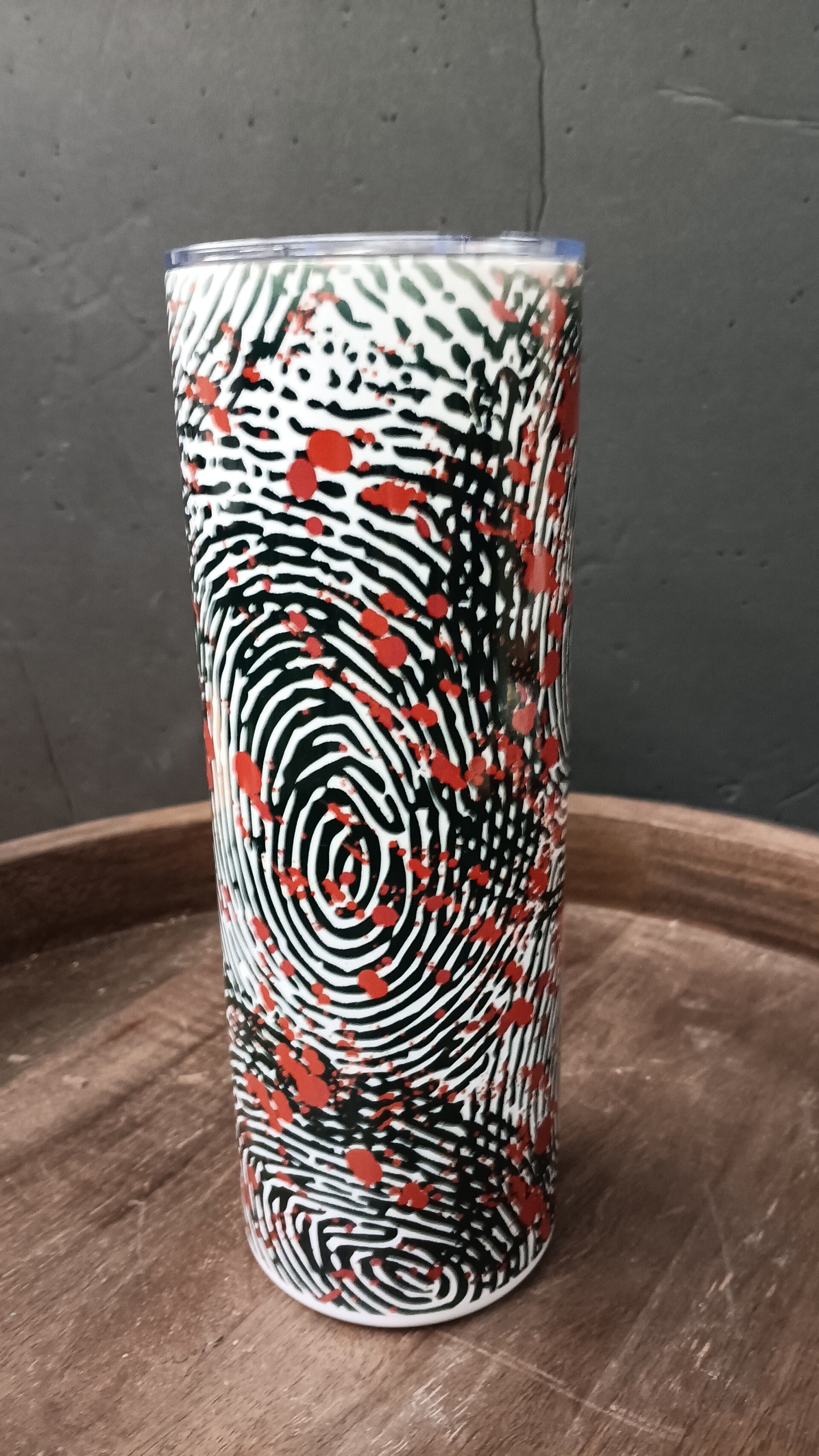 Sip with suspense. This striking tumbler wraps forensic flair and artistic edge into one unforgettable design. Featuring swirling black-and-white fingerprint patterns splashed with vivid red accents, it’s a nod to crime scene drama and the thrill of mystery. Whether you're a podcast junkie, armchair detective, or just love a little intrigue with your iced coffee, this tumbler makes a killer statement.