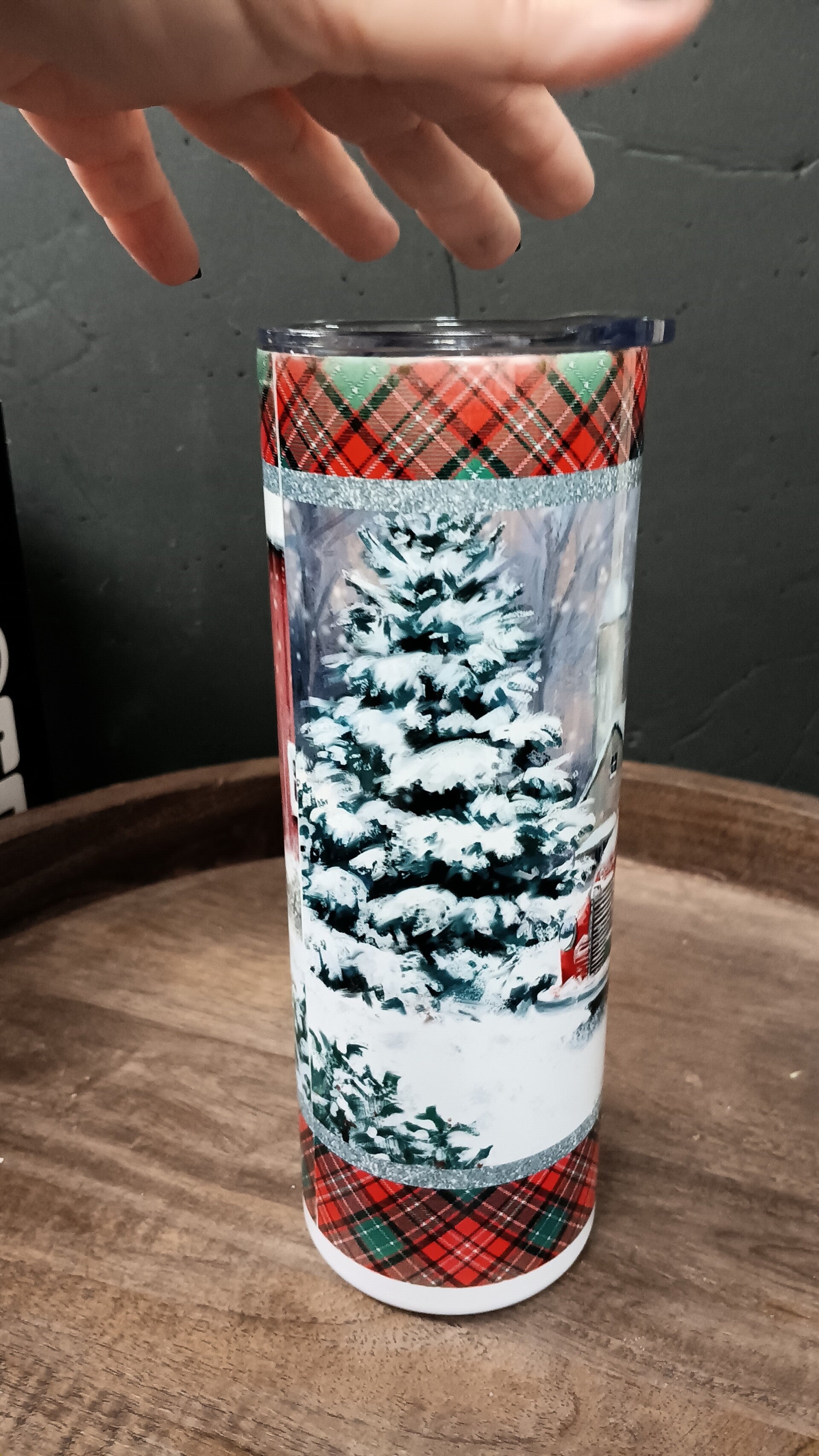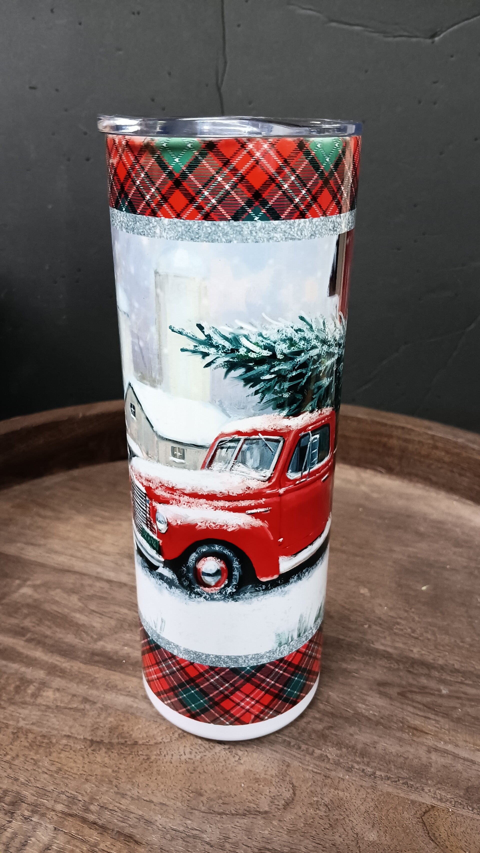 Bring rustic charm to your winter sipping! This tumbler features a vintage red truck hauling a Christmas tree through a snowy landscape, framed by classic red-and-green plaid and shimmering silver accents. It’s a nostalgic nod to country holidays and cozy cabin vibes.