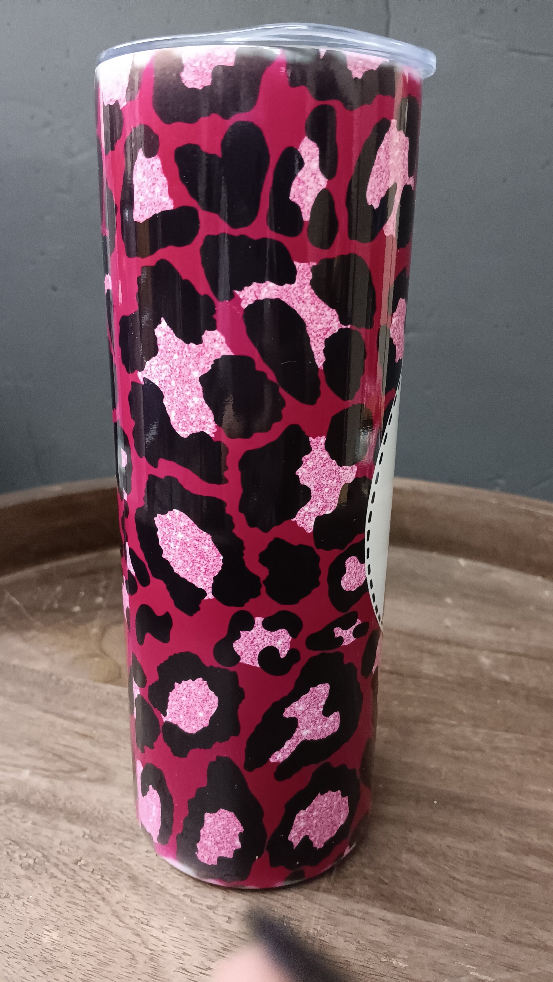 Glossy wrap with leopard print and bold coffee-themed text
