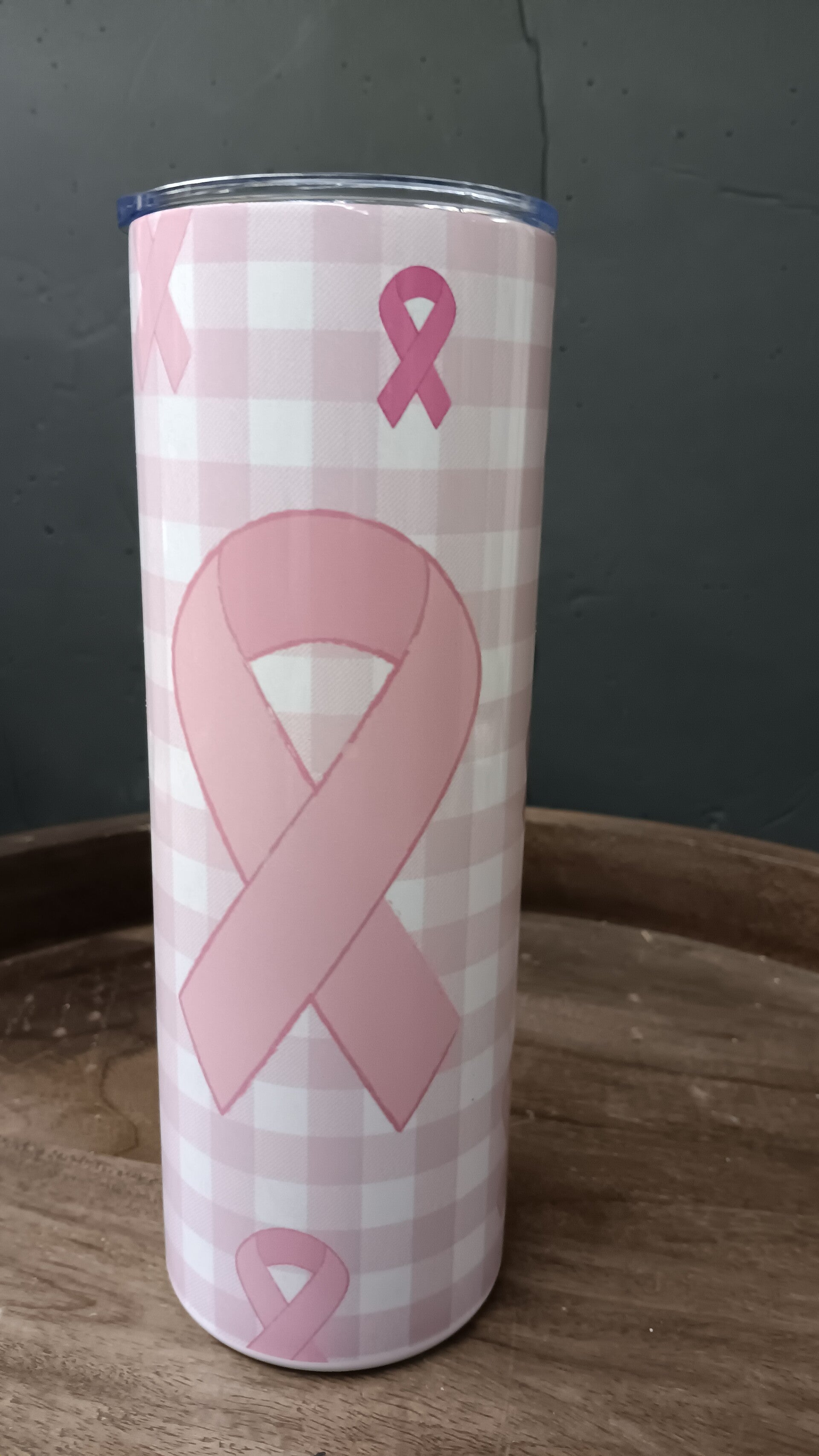 Sip with strength and support. This tumbler features a soft pink-and-white checkered background adorned with multiple pink ribbons—the universal symbol of breast cancer awareness. Whether you're honoring a loved one, supporting a cause, or simply spreading hope, this design is a beautiful reminder of resilience.