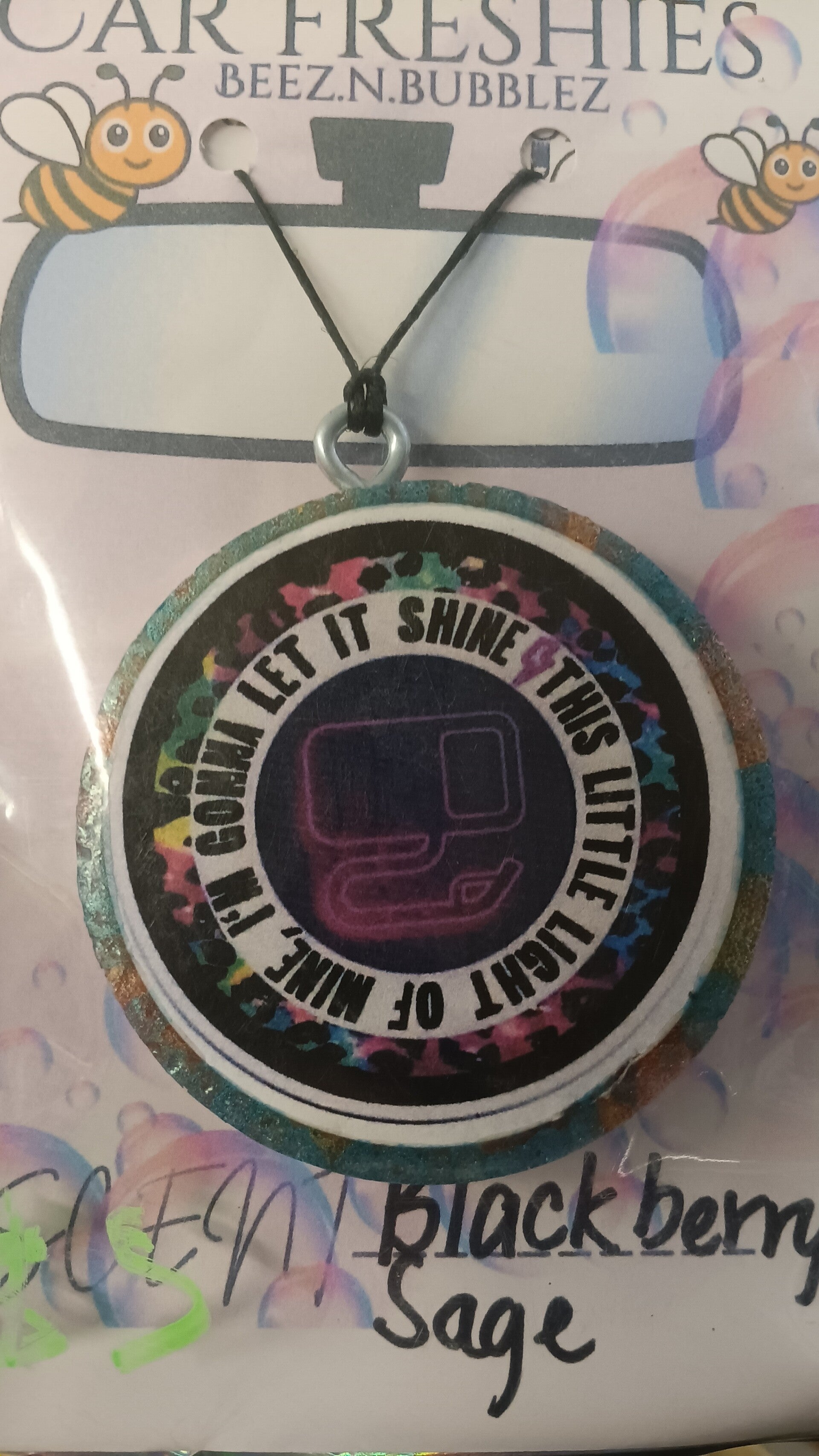 This vibrant round car freshie features a glittery, multicolored border framing a bold purple gas‑pump icon at the center. Wrapped around the design is the uplifting phrase “I’m Gonna Let It Shine — This Little Light of Mine,” giving it a fun, retro‑inspired, feel‑good vibe perfect for any car interior.