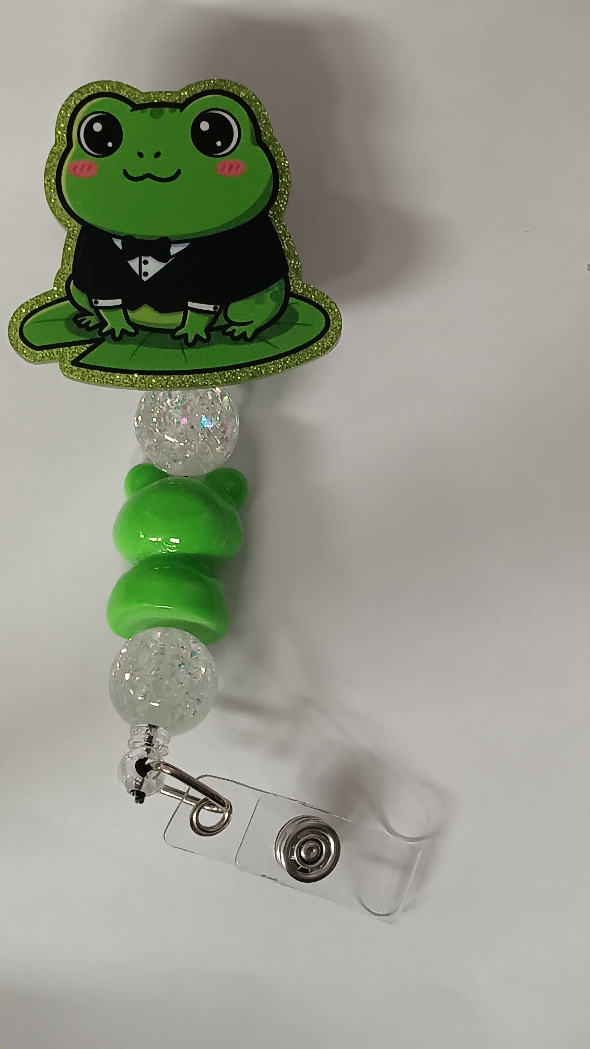 This charming little frog is dressed to impress in his tiny tuxedo, glitter‑trimmed outline, and rosy cheeks that make him impossible not to smile at. Paired with sparkly clear beads and a mini frog accent bead, this reel brings playful personality to your workday while still feeling polished and fun. Perfect for nurses, teachers, office staff, or anyone who loves a dash of whimsy on their badge.