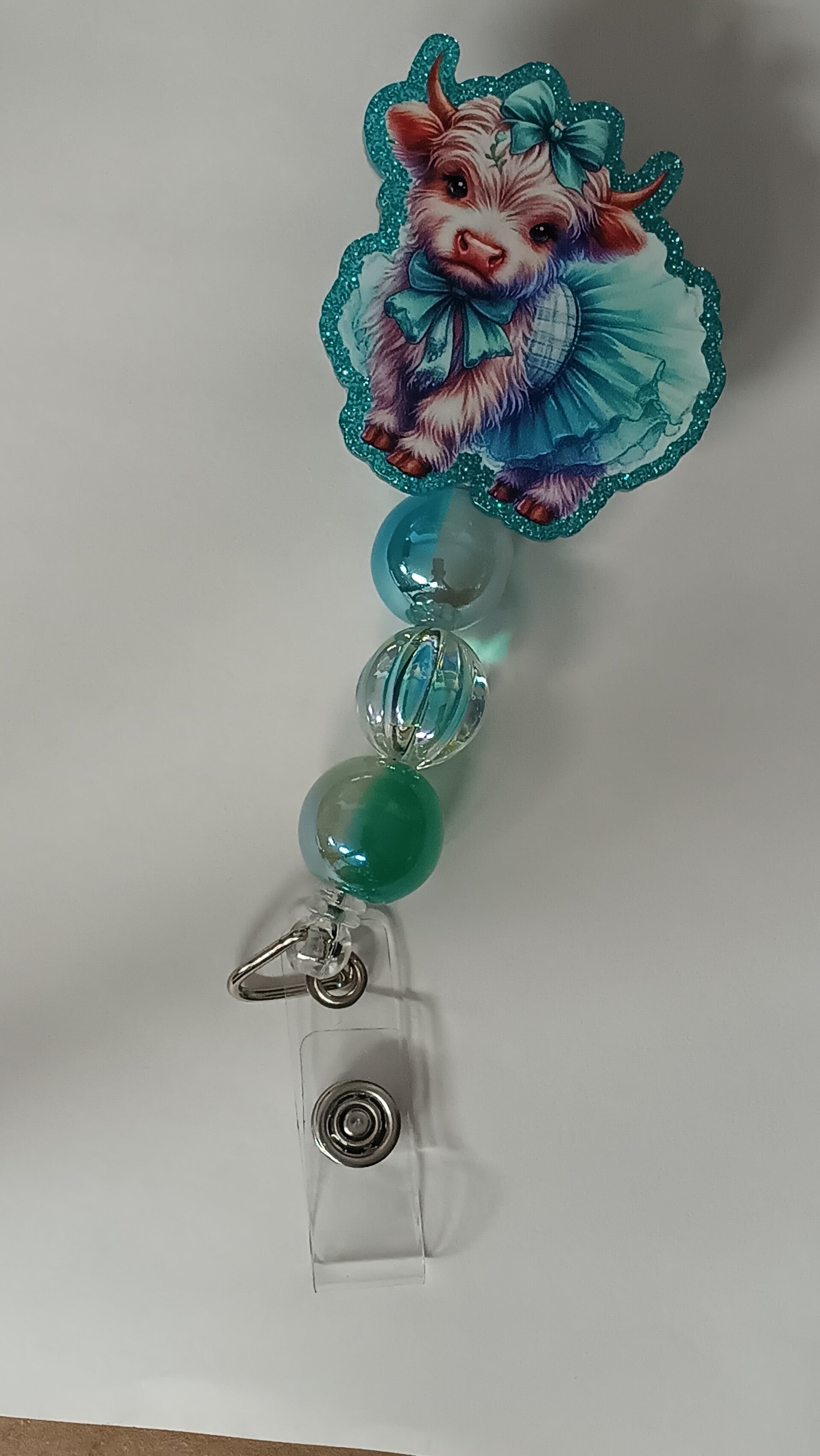 This sweet little cow is dressed to impress in a fluffy turquoise tutu and matching bow, surrounded by a sparkling glitter outline that makes her pop. Finished with coordinating turquoise and clear beads, this badge reel brings playful charm and a touch of whimsy to your everyday wear. Perfect for nurses, teachers, and anyone who loves cute, cheerful accessories that make workdays brighter.