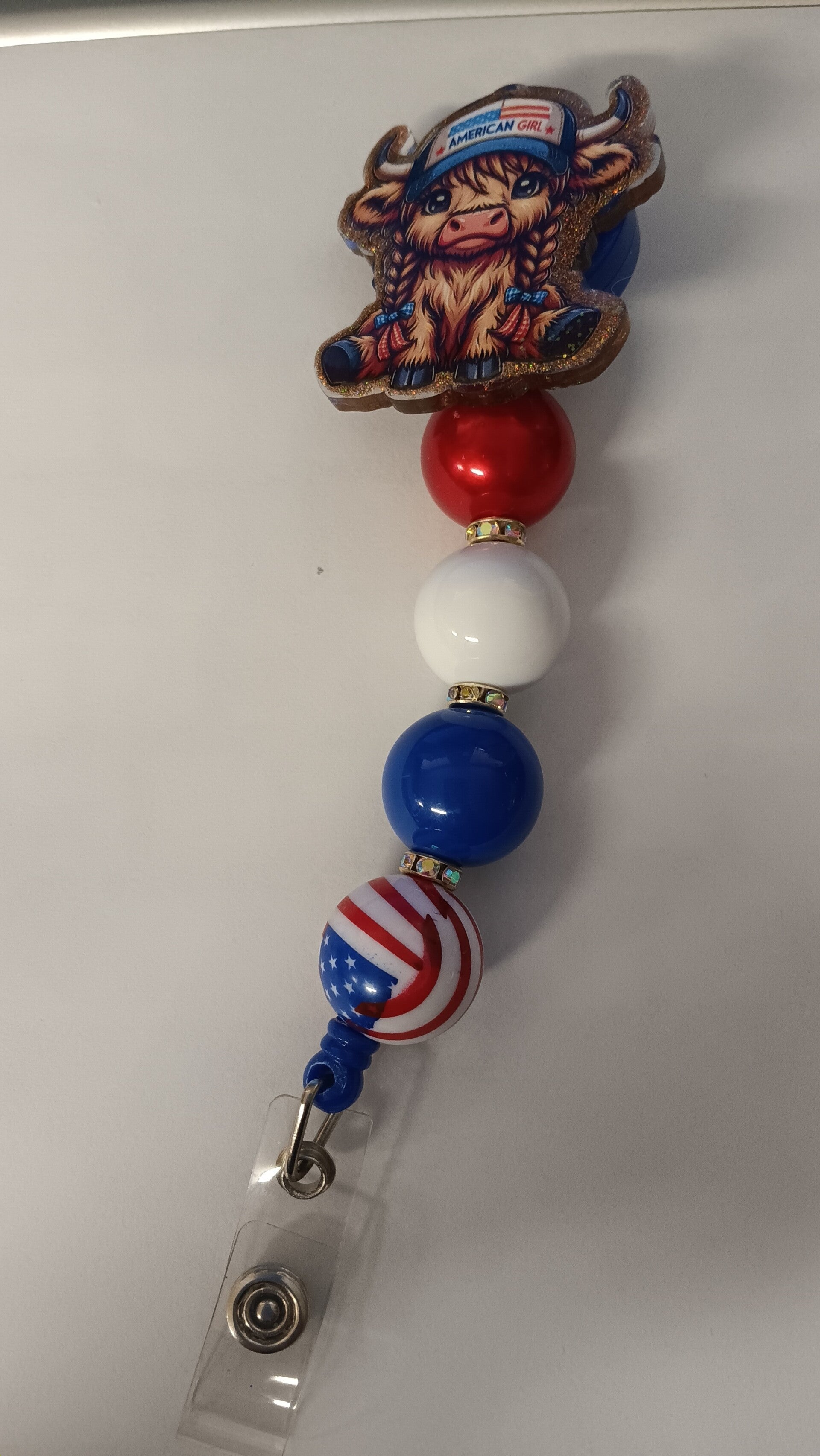 Bold and full of American pride, this badge reel features an adorable cowgirl‑inspired design paired with red, white, and blue bead accents, including a patriotic star‑spangled detail. With its fun western flair and festive colors, it’s the perfect accessory for showing off your love for country style and patriotic vibes. Great for holidays, summer events, or everyday wear with a little extra spirit.